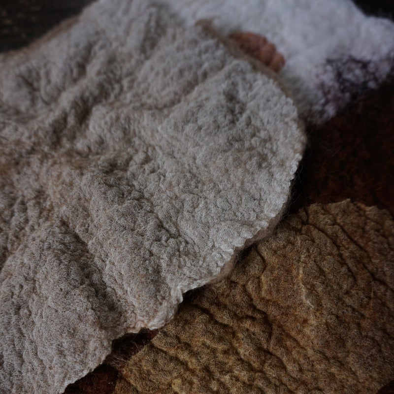 Natvilten is een oud ambacht waarbij wol door zeep, warmte en wrijving van de handen gaat vervilten. De schubben van de wol haken bij dit proces in elkaar. De wol krimpt en er ontstaat een stevige lap vilt. Een proces wat tijd en spierkracht vergt, maar elke keer weer verwonderd.