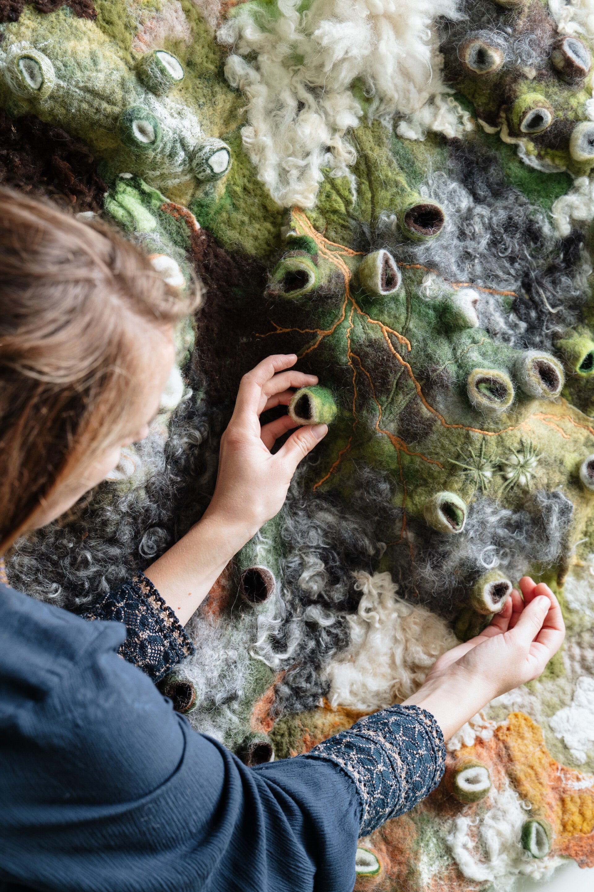 Ik werd emotioneel van wat ik zag. Dit komt doordat mijn man verleden jaar is overleden, hij hield van de natuur en we wandelden heel veel samen, zijn achternaam was Eikenboom. Waardoor ik besloot om haar te vragen het bewuste blad in vilt te maken. Ik zag alleen op tegen het reizen omdat ik dacht dat ze niet echt in de buurt zou wonen want ik kom zelf uit Maastricht. Wat schetst onze verbazing dat haar atelier op nog geen vijfhonderd meter van mijn appartement ligt. Het voelt als een voorbestemde ontmoeting.